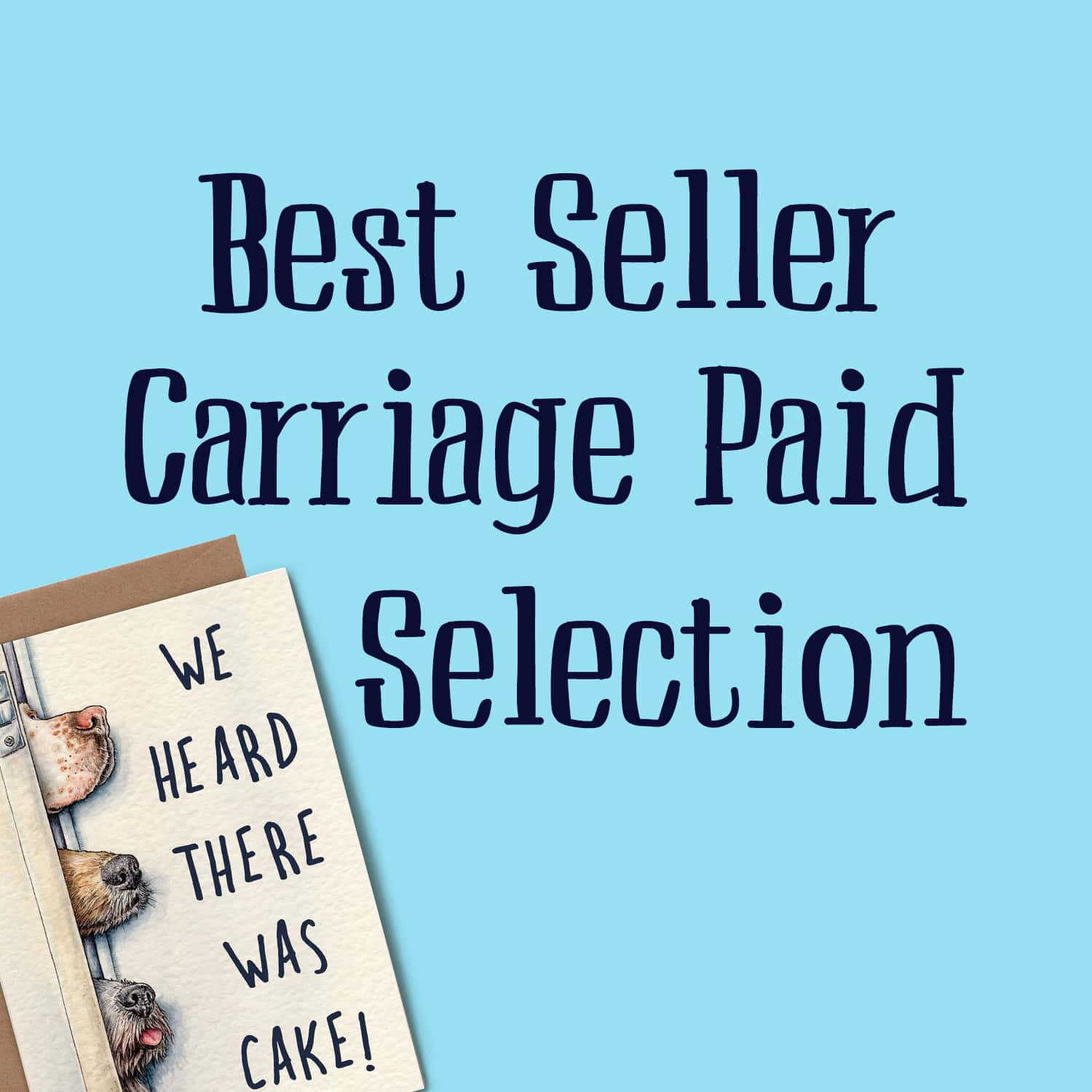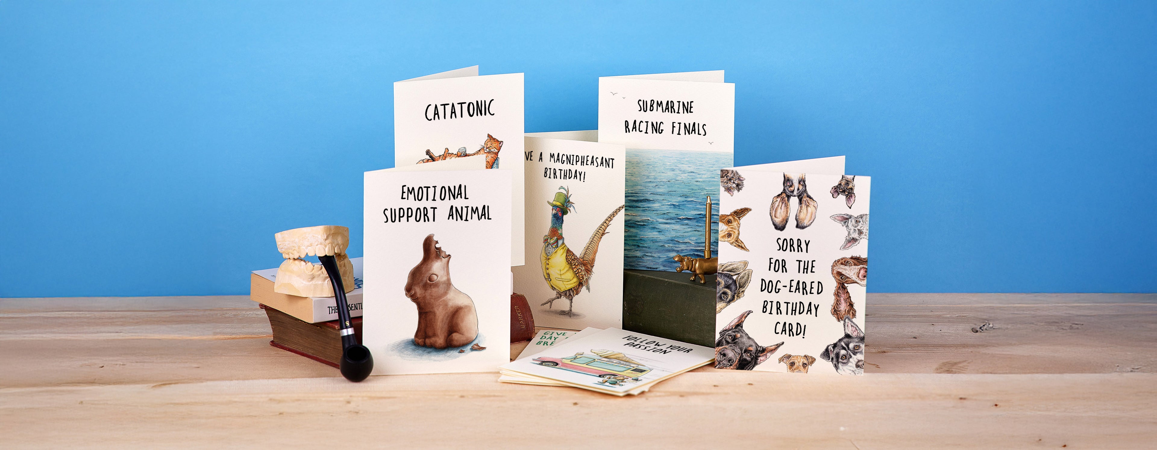 Our daft greeting cards are £1.20 +VAT, sold in packs of six (sixes).